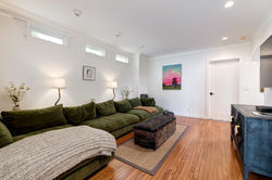 The chef-inspired kitchen has been thoughtfully updated to fulfill every culinary enthusiast's dream. It boasts a central island with sleek stainless steel appliances, modern concrete countertops, ample cabinet space, and a built-in kitchen table with comfortable bench seating for quick meals or savoring your morning coffee. Adjacent to the kitchen, a concealed laundry area, cleverly hidden behind custom cabinetry, offers added convenience and extra storage space.