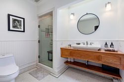 The bedrooms are generously sized and feature expansive windows, bathing the rooms in natural light. Upstairs, two bedrooms share a spa-like bathroom, complete with a double vanity, a luxurious soaking spa tub, and a walk-in shower. The downstairs bedroom, positioned at the rear of the house, treats you to an upholstered bay window seat, allowing you to gaze out onto the enchanting garden through large windows.